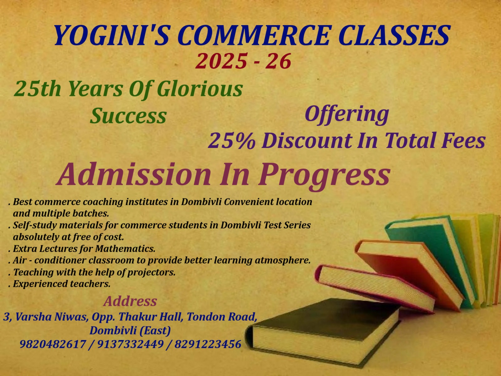 Top Tutorials For Class XII Commerce in Dombivali Starting your Class XII Commerce journey? Yoginis Commerce Classes in Dombivali provides top-notch tutorials for Class XII Commerce, helping students build a strong foundation in subjects like Accountancy, Economics, and Business Studies. Our program is designed to make learning engaging and effective, ensuring students excel in their academics. At Yoginis Commerce Classes, we focus on simplifying complex concepts and providing practical examples to enhance understanding. Our experienced faculty ensures personalized attention, regular assessments, and a structured approach to learning. With our guidance, students can confidently tackle their Class XII syllabus and prepare for future challenges. Enroll now to secure your academic success! Call or visit Yoginis Commerce Classes in Dombivali to join our tutorials for Class XII Commerce.